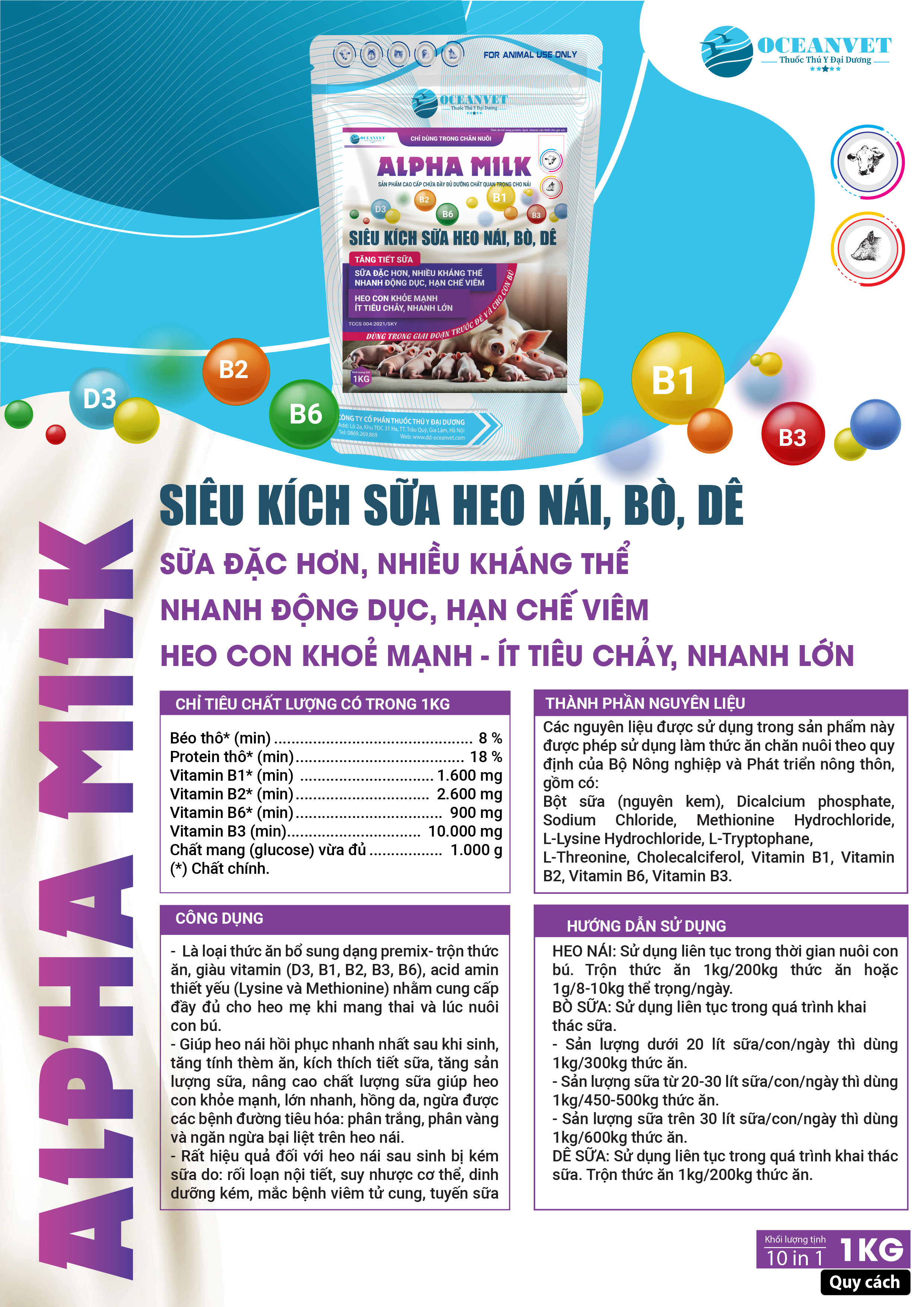 ALPHA MILK là sản phẩm siêu kích sữa dành cho heo nái, bò, dê, giúp tăng tiết sữa, cải thiện chất lượng sữa, hạn chế viêm nhiễm và giúp con non phát triển khỏe mạnh.