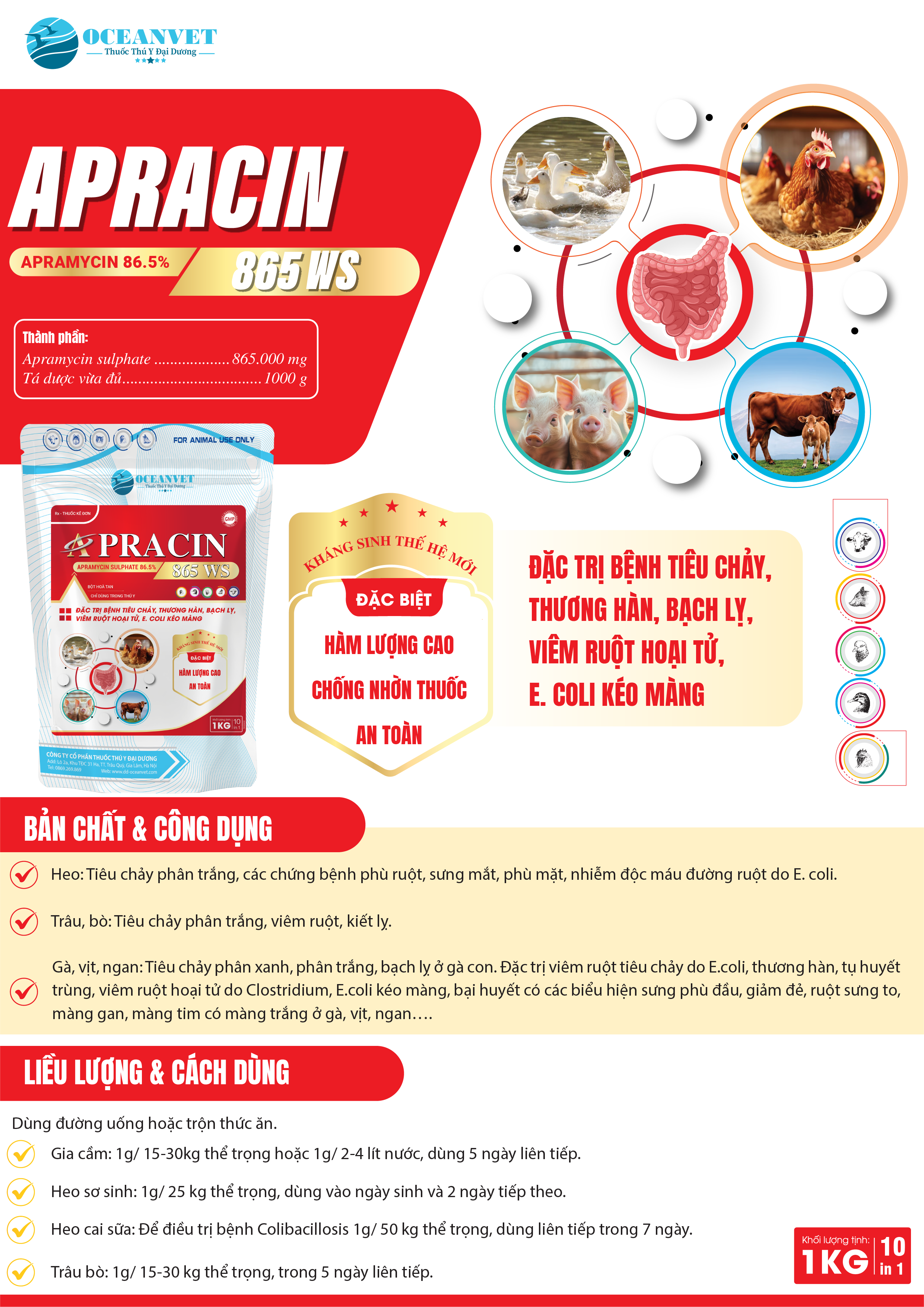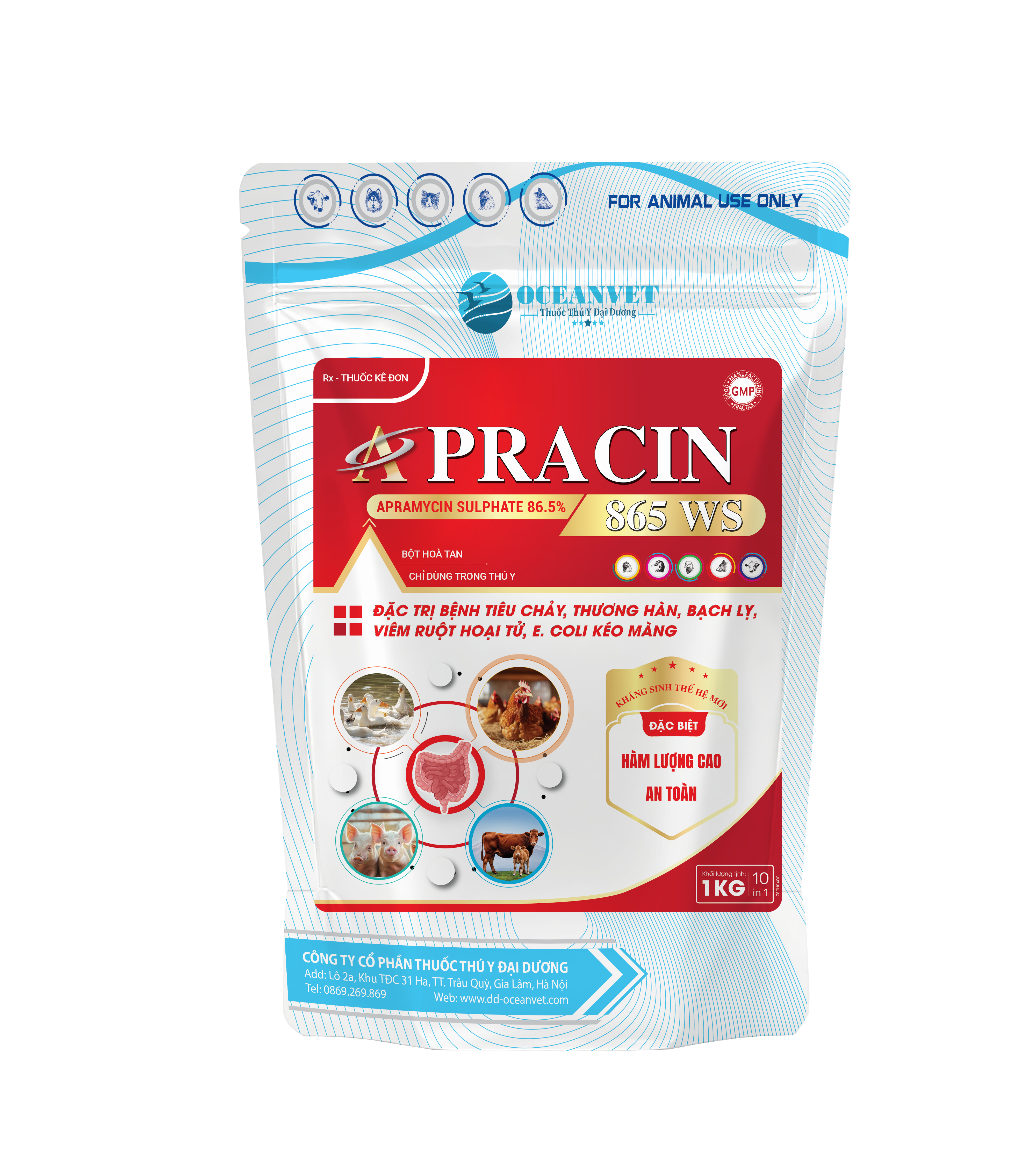 APRACIN 865 WS là kháng sinh thế hệ mới với hoạt chất Apramycin sulphate 86.5%, mang lại hiệu quả vượt trội trong điều trị các bệnh tiêu chảy, viêm ruột, thương hàn, bạch lỵ, E. coli kéo màng ở gia súc và gia cầm.