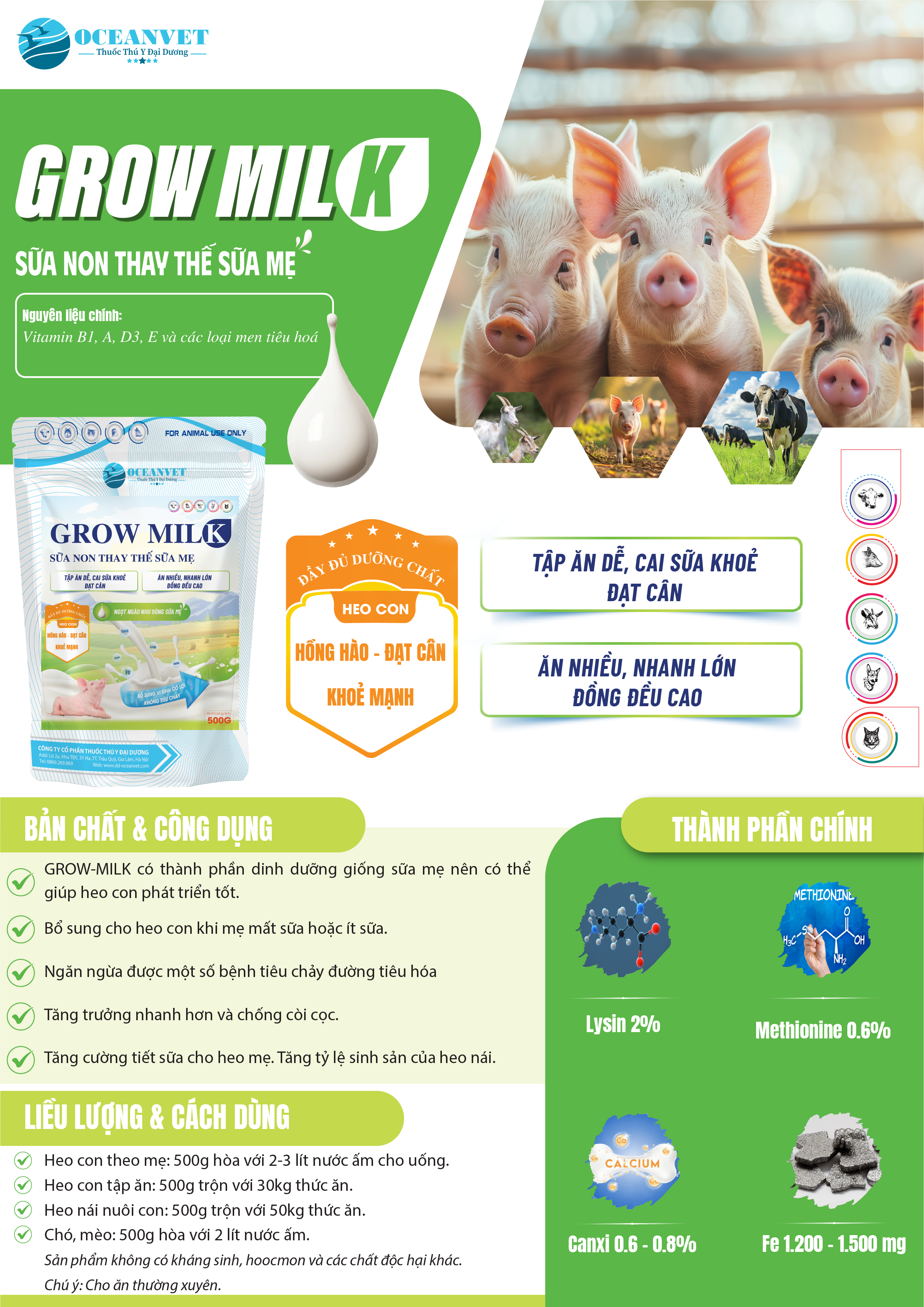 Các acid amin thiết yếu như Lysin, Methionine, cùng hàm lượng canxi, sắt, vitamin cao giúp heo con ăn ngon miệng, tăng trưởng nhanh, da hồng hào và tăng trọng đều trong đàn.